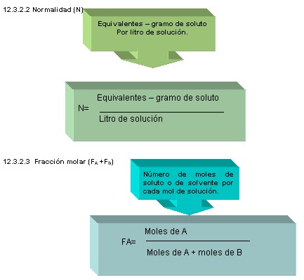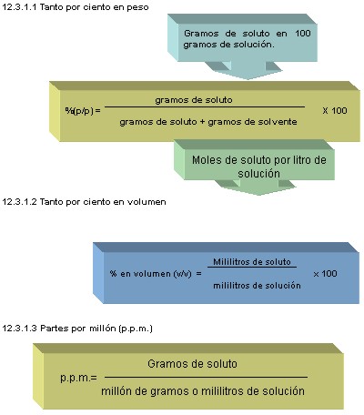 La cantidad de sustancia disuelta puede expresarse en unidades físicas gramos, o en unidades químicas moles, o equivalentes y con referencia a un volumen o a un peso de solvente o de solución.