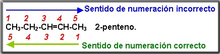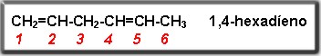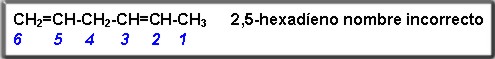 En el ejemplo anterior podríamos numerar el compuesto en el sentido derecha a izquierda, pero su nombre quedaría incorrecto ya que los carbonos que presentan los dobles enlaces tomaran un mayor valor.