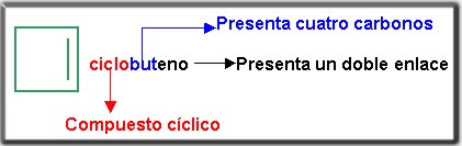 Existen compuestos cíclicos denominados cicloalquenos, para su nomenclatura tenemos en cuenta el número de carbonos que lo componen. Para su numeración partimos del carbono que posea el doble enlace y anteponemos la palabra ciclo seguida del número de carbonos y con la terminación eno.