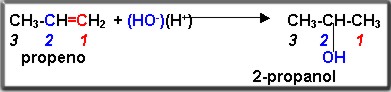 El carbono dos presenta un solo hidrógeno, mientras si observamos el carbono uno presenta dos hidrógenos. Siguiendo la regla de Markovnicov. El hidrógeno se unirá al carbono uno y el hidróxilo al carbono dos.