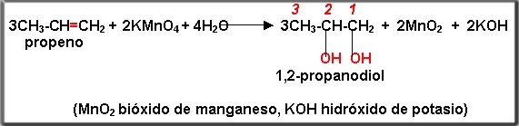 De la oxidación obtenemos glícoles compuestos formados por dos grupos hidroxílo (OH-), para ello utilizamos permanganato de potasio (KMnO4). Ejemplo: