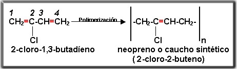 En la reacción el 2-cloro -1,3 -butadíeno existen dos dobles enlaces, mientras que en el 2-cloro-2-buteno presenta uno solo, el anterior proceso es utilizado en la obtención de caucho sintético. Una vez obtenido es sometido a un proceso de vulcanización consistente en elevar la temperatura del caucho, con la adición de vapores de azufre para formar unión de monomeros.