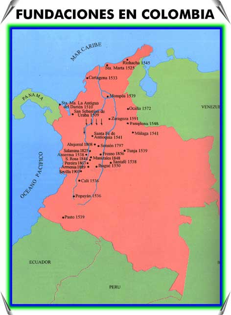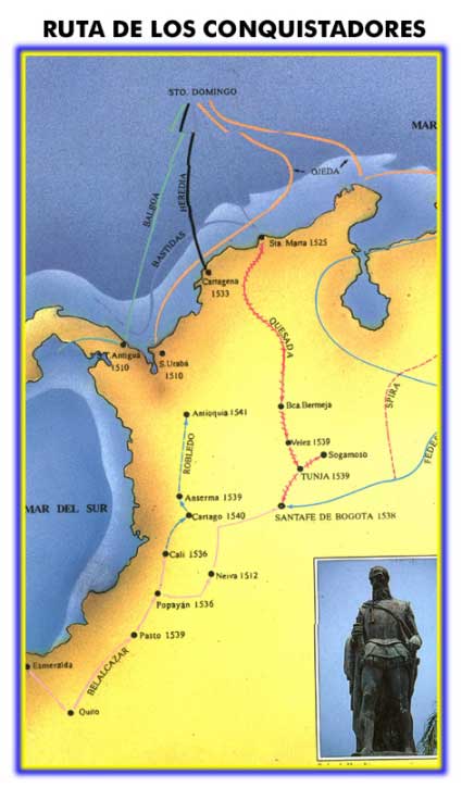 Después de haber conocido estas dos costas se inició la penetración al país. Gonzalo Jiménez de Quesada inició el proceso de conquista al interior de Colombia, en 1538 fundando a su paso ciudades, entre ellas Santafé de Bogotá en 1538 y sometiendo a los indígenas. El sur del país fue conquistado por Sebastián de Belarcázar, quien fundó Popayán y Cali, y el oriente fue conquistado por Nicolás de Federmán.