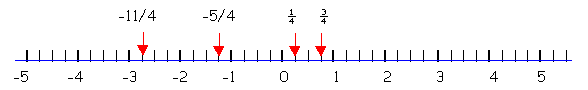 Representemos en la recta numérica números racionales de denominador 4. Ejemplo: ¼, ¾, -5/4, -11/4 |