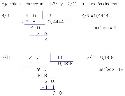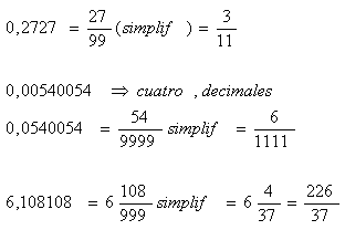 escribimos por numerador un período de la fracción decimal y por denominador la misma cantidad de nueves, como cifras tenga el período. |