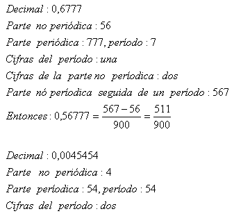 Para hallar la generatriz de una fracción decimal colocamos por numerador la fracción decimal sin la coma, y por denominador la unidad seguida del mismo número de ceros como cifras decimales haya. |