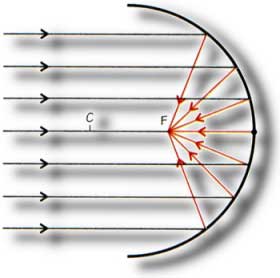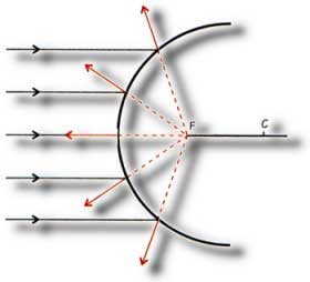 En la figura anterior se muestra la forma como se refleja la luz en los espejos cóncavos y convexos. Los rayos que se reflejan en un espejo cóncavo convergen en un punto F; y los rayos reflejados en un espejo convexo se separan, o sea, que se divergen. Si prolongamos estos rayos reflejados podemos observar que estos rayos se cruzan en el punto denominado como F o Foco y la distancia del foco al vértice se denomina distancia focal. El foco del espejo está localizado exactamente en la mitad del radio de curvatura. |