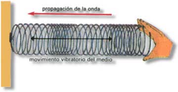 Las vibraciones de la onda coinciden, con la dirección. Los resortes son ejemplos prototipo de estas ondas. Si se tiene un resorte fijo en un extremo (posición de reposo), lo hala y luego lo suelta se puede observar: