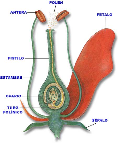 Pistilo: Es el órgano reproductor femenino de la flor y se encuentra casi siempre en el centro. Está constituido por el ovario y el estilo. El estilo nace en el ovario y posee, en el